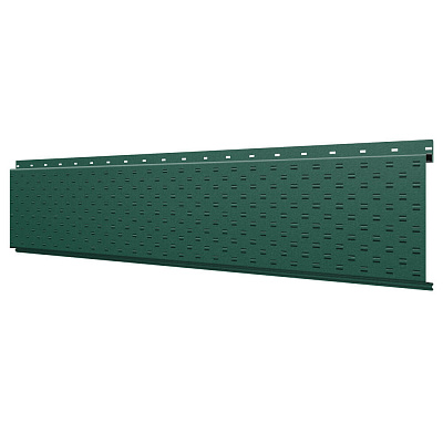 Линеарная потолочно-стеновая панель с ПЕРФОРАЦИЕЙ для вентиляции цвет RAL6005 Зеленый Мох Стальной Бархат применяется в качестве софитов для подшивы крыши, наружной и внутренней отделки потолков, стен, фронтонов фасада дома в Перми.