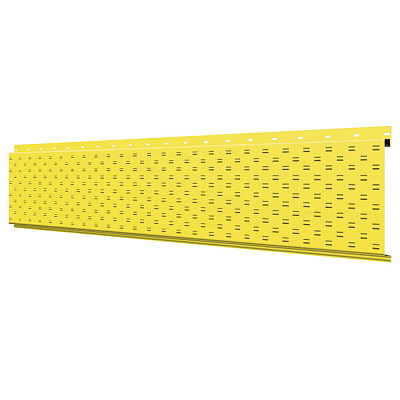 Линеарная потолочно-стеновая панель с ПЕРФОРАЦИЕЙ для вентиляции цвет RAL1018 Желтый применяется в качестве софитов для подшивы крыши, наружной и внутренней отделки потолков, стен, фронтонов фасада дома в Перми.