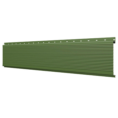 Линеарная потолочно-стеновая панель РИФЛЕНАЯ усиленная цвет RAL6002 Зеленый Лист применяется в качестве софитов для подшивы крыши, наружной и внутренней отделки потолков, стен, фронтонов фасада дома в Перми.